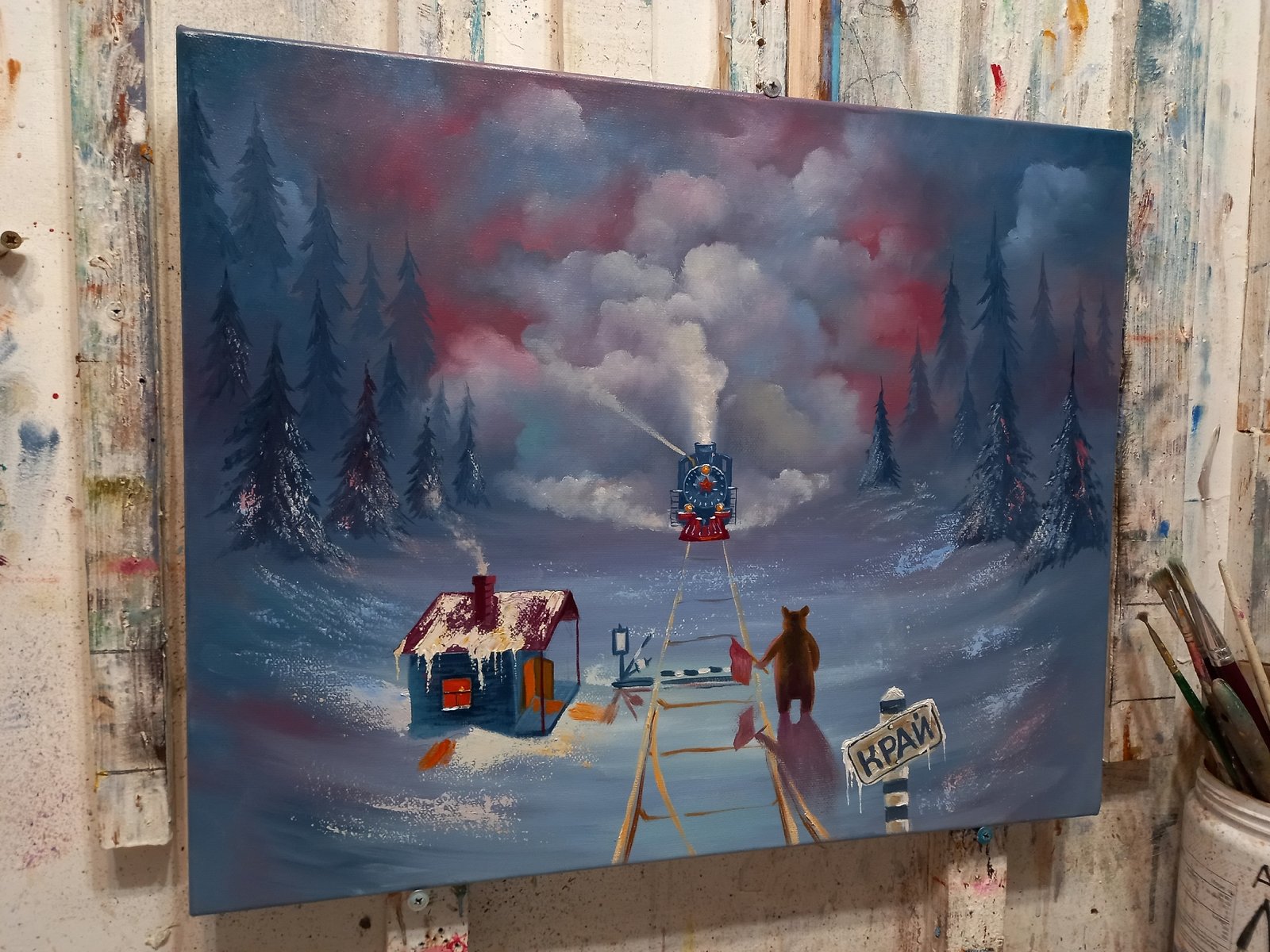 В памяти всплывает заснеженный лесной край, где среди деревьев проложена железнодорожная ветка, уводящая вдаль. Этот образ стал отправной точкой для картины "Край". Хотелось передать атмосферу тревожного ожидания — приближается поезд, и медведь на путях, замерший с красным флагом в лапе, создаёт ощущение драмы. Темное небо с тяжёлыми облаками добавляет напряжения, а маленькая избушка слева выглядит как символ отдалённости и беззащитности. В итоге, работа получилась сдержанной по цвету, но насыщенной эмоциями.