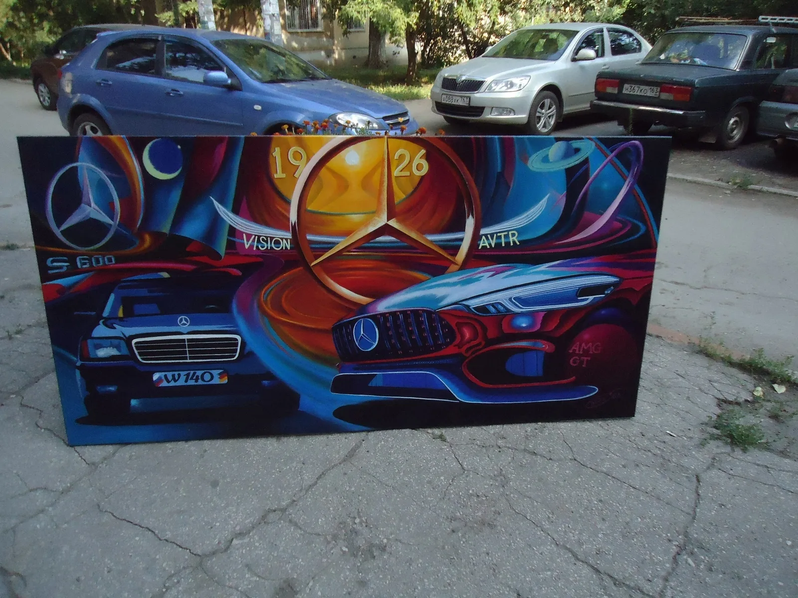 Картина "Мерседес от Кабана до Аватара" — это история о том, как эволюционировали модели этой марки с течением времени. Работал над ней долго, тщательно прорабатывая каждую деталь, и в итоге сумел передать динамичный характер автомобилей. Вдохновил меня на создание этой работы сам бренд Mercedes с его богатой историей и инновационным дизайном. В центре картины расположились рядом два автомобиля разных поколений — от классики до современных моделей, символизируя связь между прошлым и настоящим.