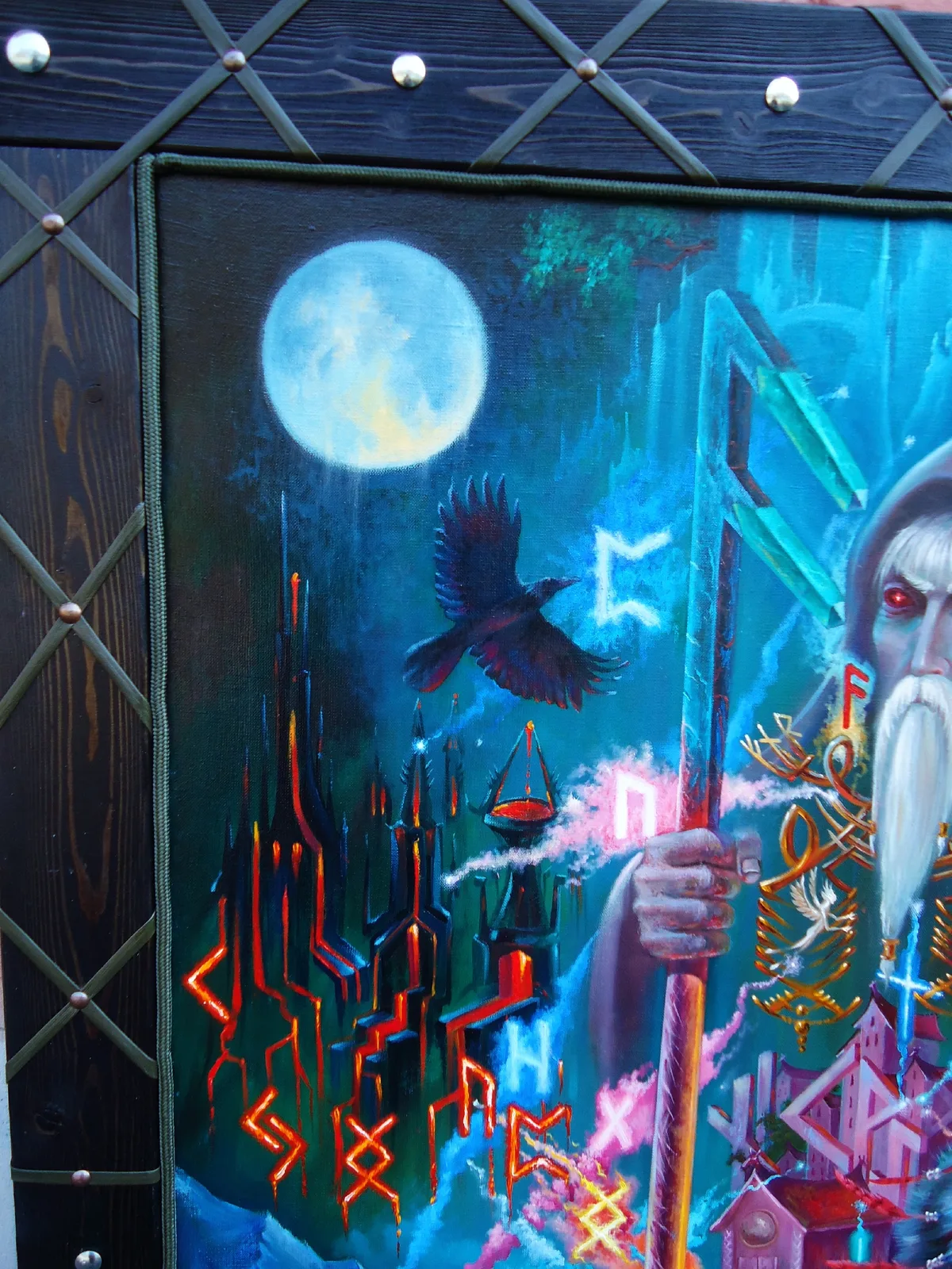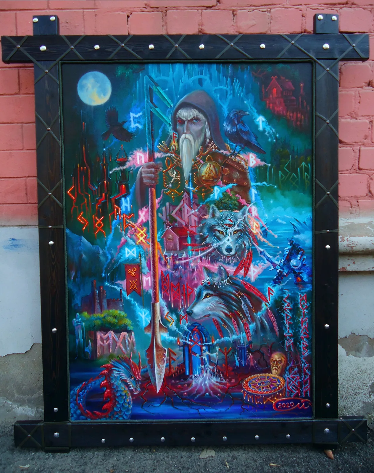 Картина изображает Одина — главного бога в скандинавской мифологии — в окружении символов и существ из древних легенд. В центре композиции возвышается фигура старого воина с длинной белой бородой и пронзительным взглядом. Его окружают вороны, волки и мистические руны, создавая атмосферу тайны и могущества. Древо Иггдрасиль, символизирующее связь между мирами, наполняет пространство вокруг него магией. Яркие, насыщенные цвета усиливают ощущение мистического ритуала.