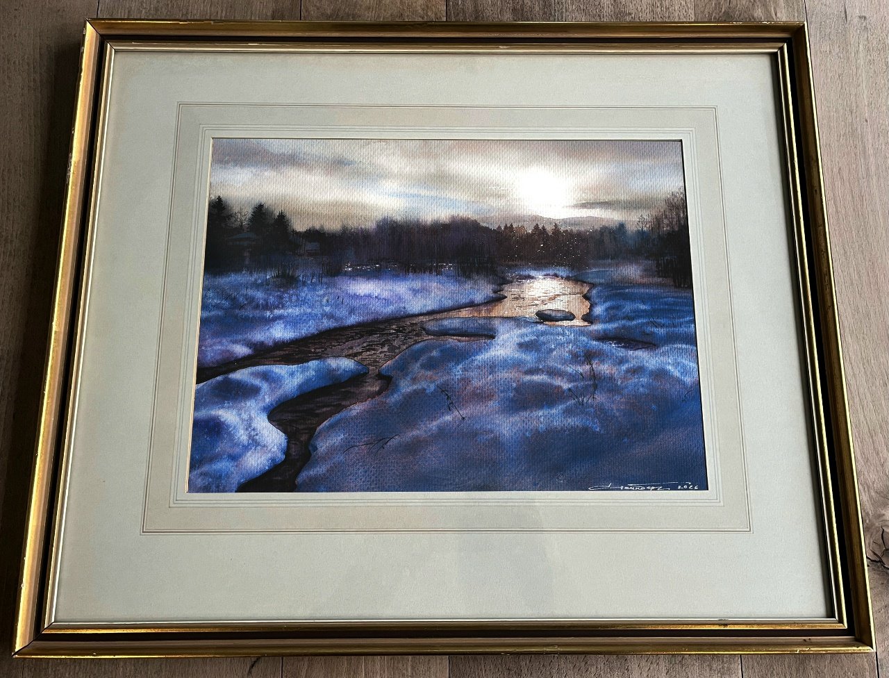 Картина изображает зимний пейзаж с речкой, окруженной снежными берегами и деревьями вдали.