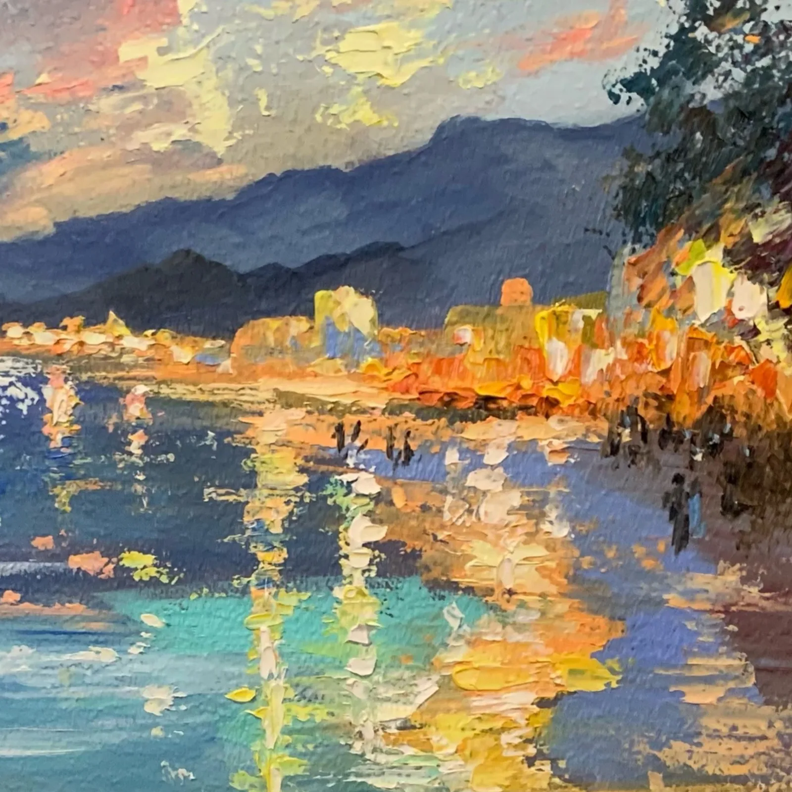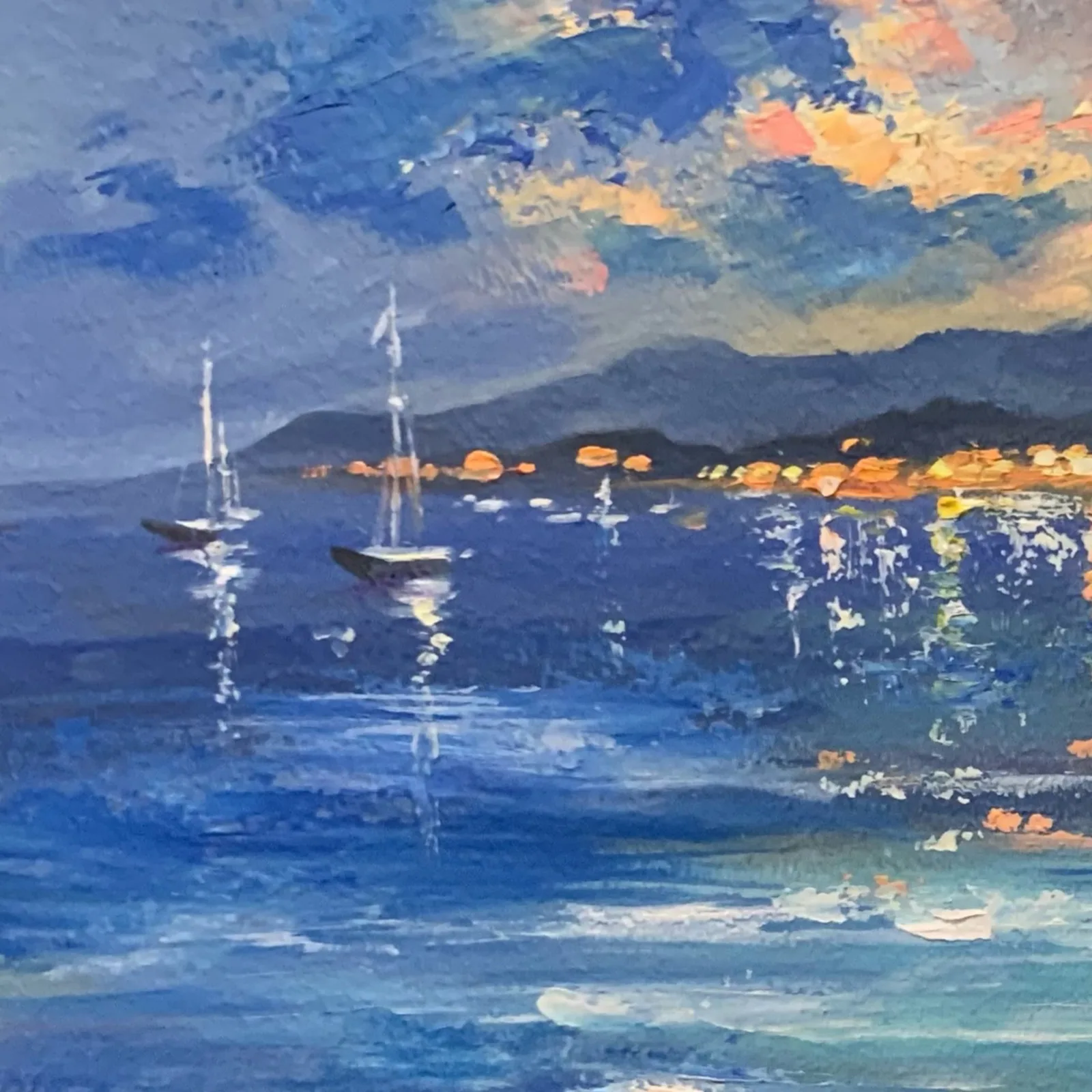 Солнечные блики танцуют на волнах, мягко омывающих скалистый берег. Вдалеке видны огни прибрежного города, а в море стоят на якоре яхты с белыми парусами. На переднем плане море играет и пенится у скал, создавая ощущение спокойствия и умиротворения. Этот момент тихой летней ночи запечатлён художником в картине "Берег золотой".