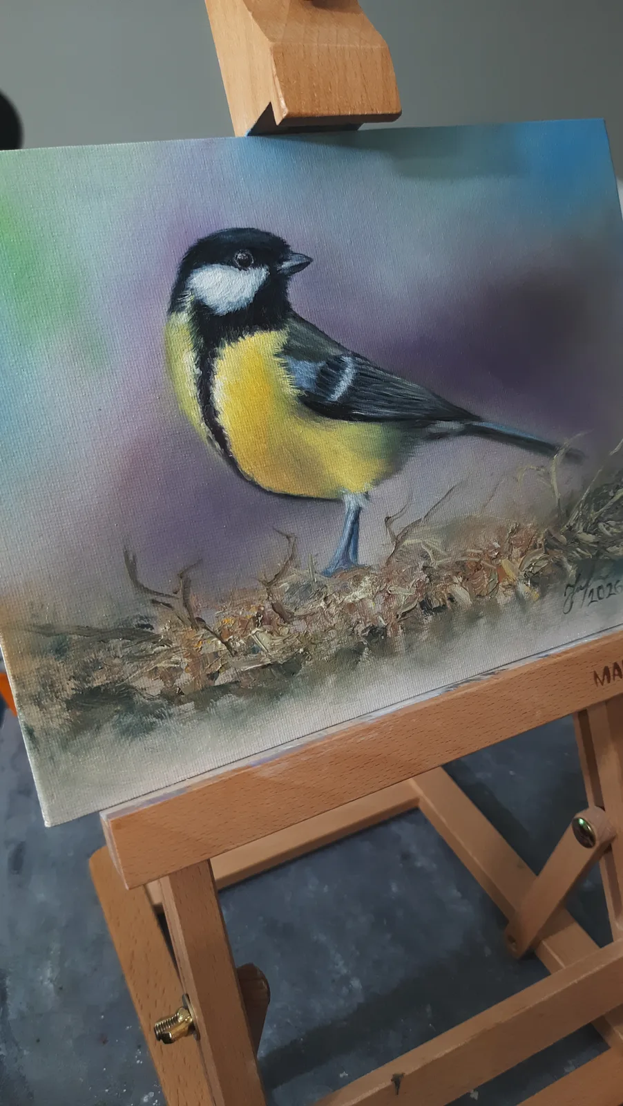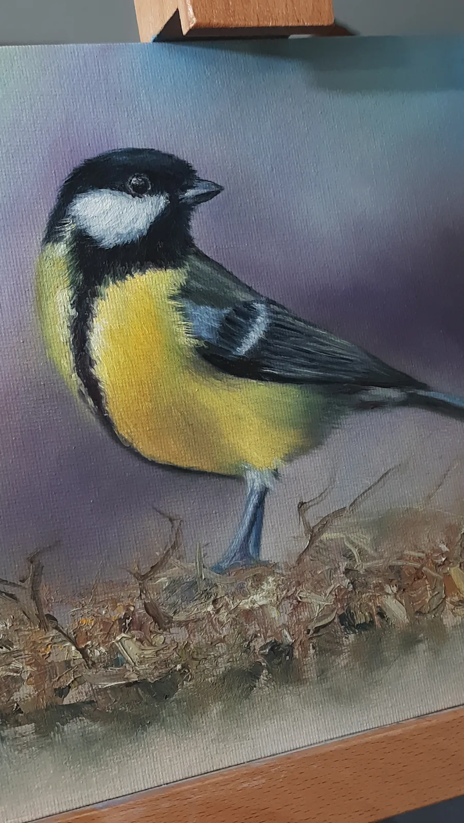 На картине изображена синица, сидящая на куче сухих листьев и веточек. Птица окрашена в яркие цвета — желтую грудку, черную голову с белыми щеками и серые крылья. Фон картины мягкий и размытый, с плавными переходами между синими, фиолетовыми и зеленоватыми оттенками, что создает спокойную атмосферу.
