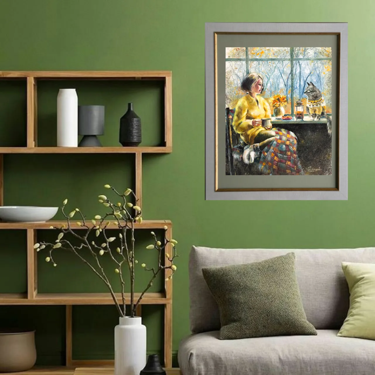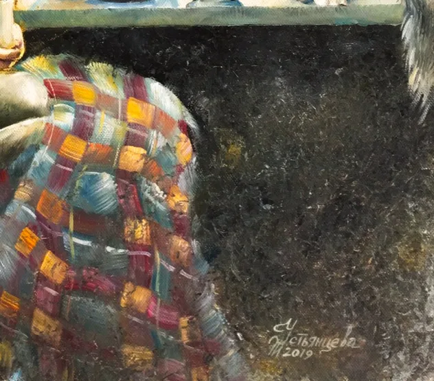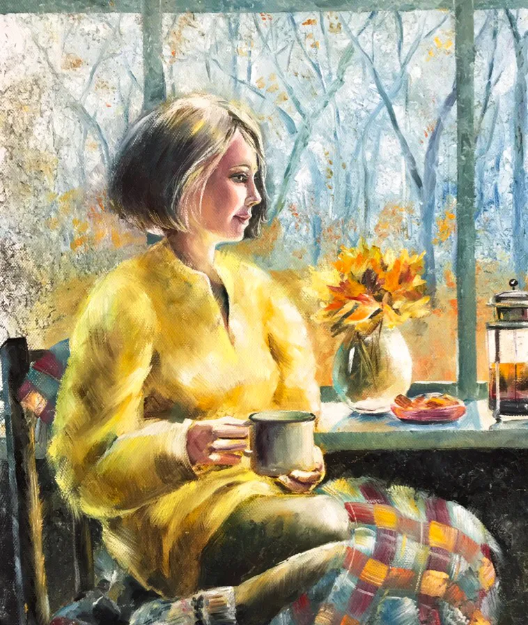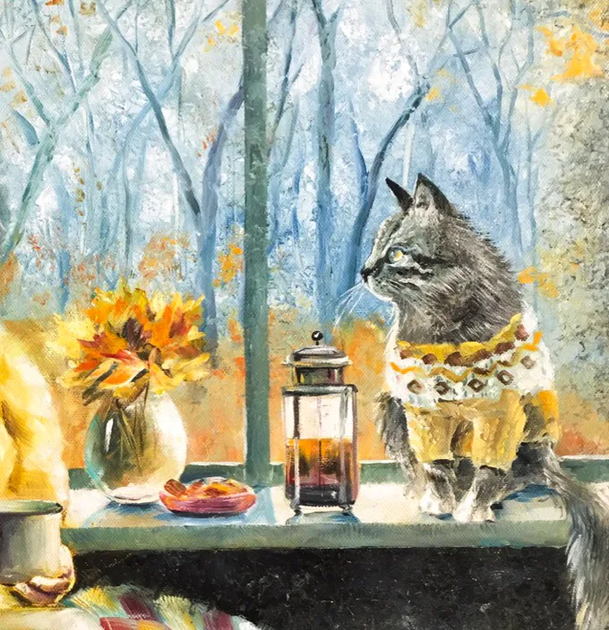 Картина "У осеннего окна" - прекрасное приобретение для любой коллекции. Она цепляет своей уютной атмосферой и теплотой: девушка, сидящая у окна с чашкой в руках, кошка рядом, осенняя листва за окном - всё это создаёт ощущение спокойствия и тишины. Обратите внимание на мастерское использование цвета и света, а также на детали, такие как плед на коленях девушки и осенние листья в вазе. В интерьере эта работа будет смотреться особенно хорошо в тёплом, домашнем окружении, добавляя комнате осеннее настроение.