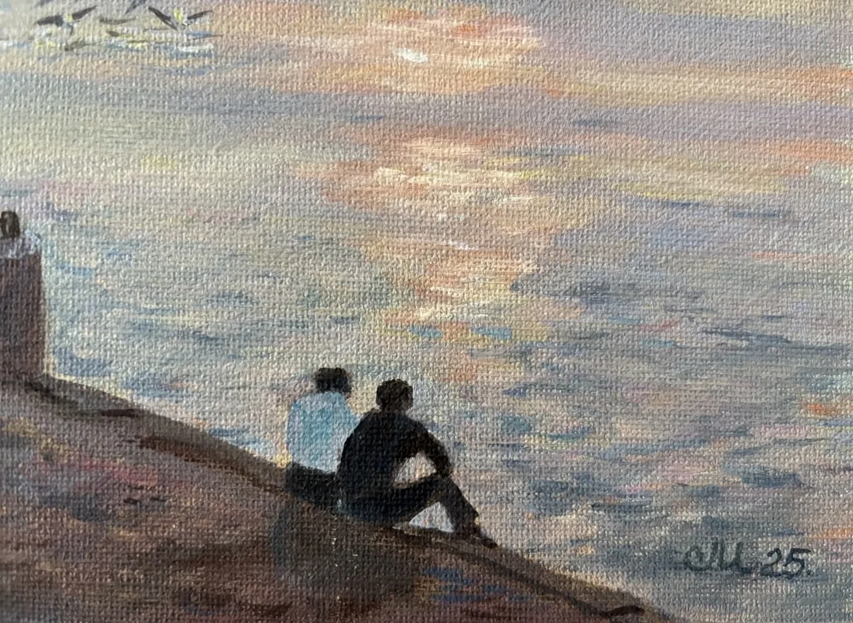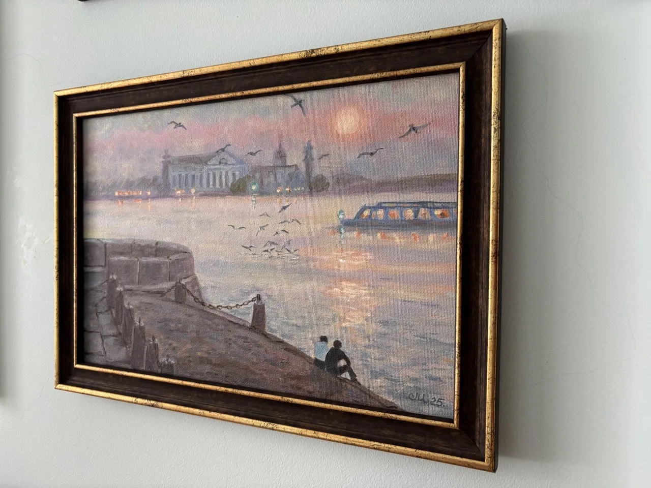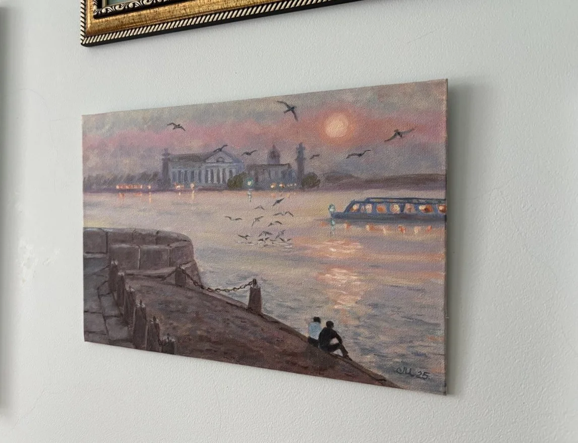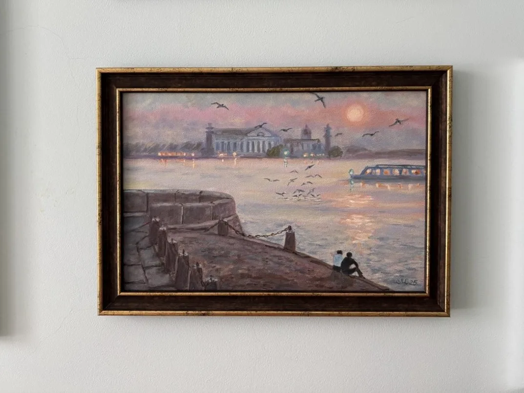На картине изображен вечерний пейзаж в Санкт-Петербурге. Мы видим набережную, на которой сидят два человека, наслаждаясь видом на реку.