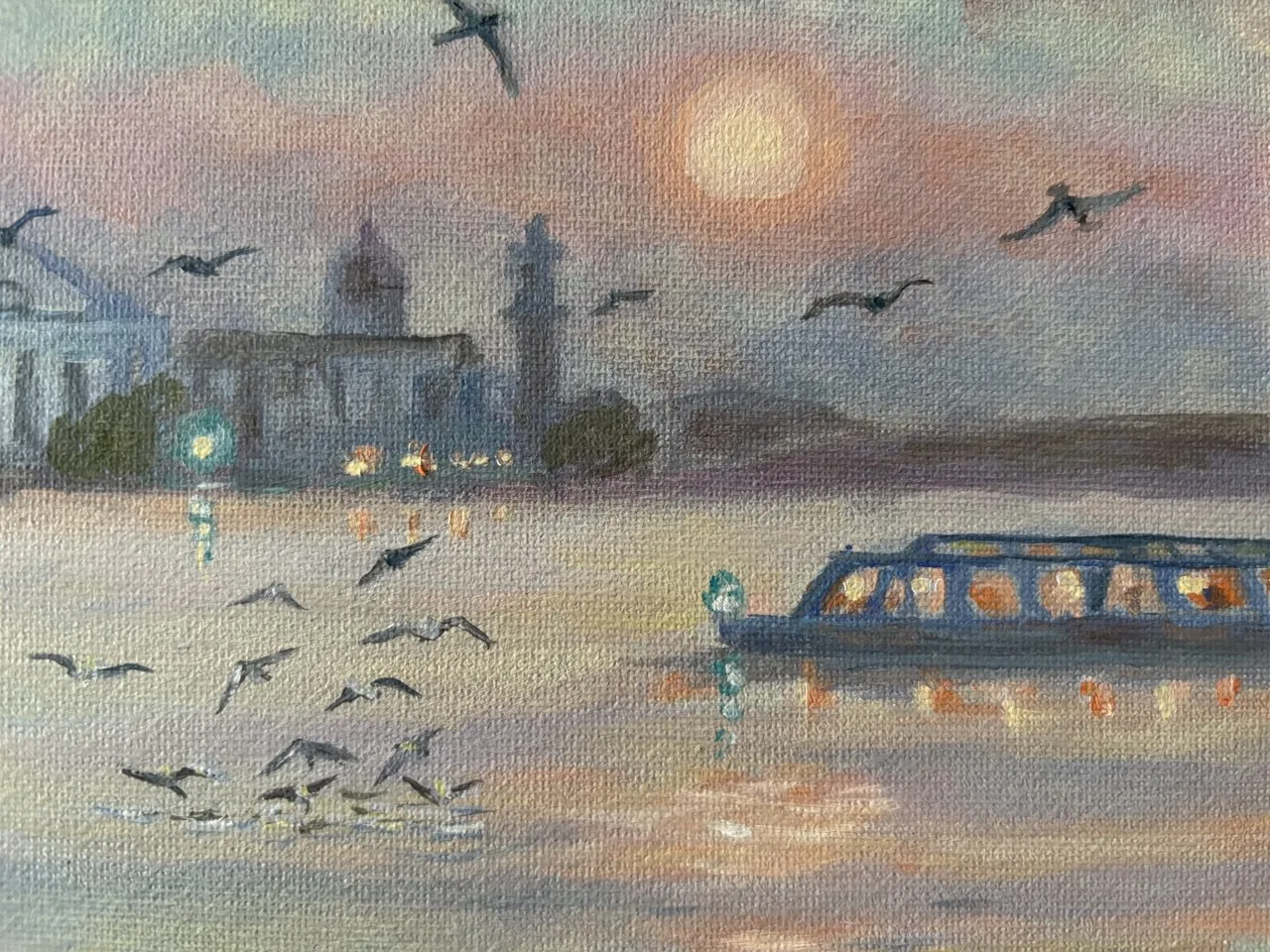 Небо окрашено в теплые оттенки заката, а на воде отражается свет. В воздухе летают чайки, а на реке плывет прогулочный катер.