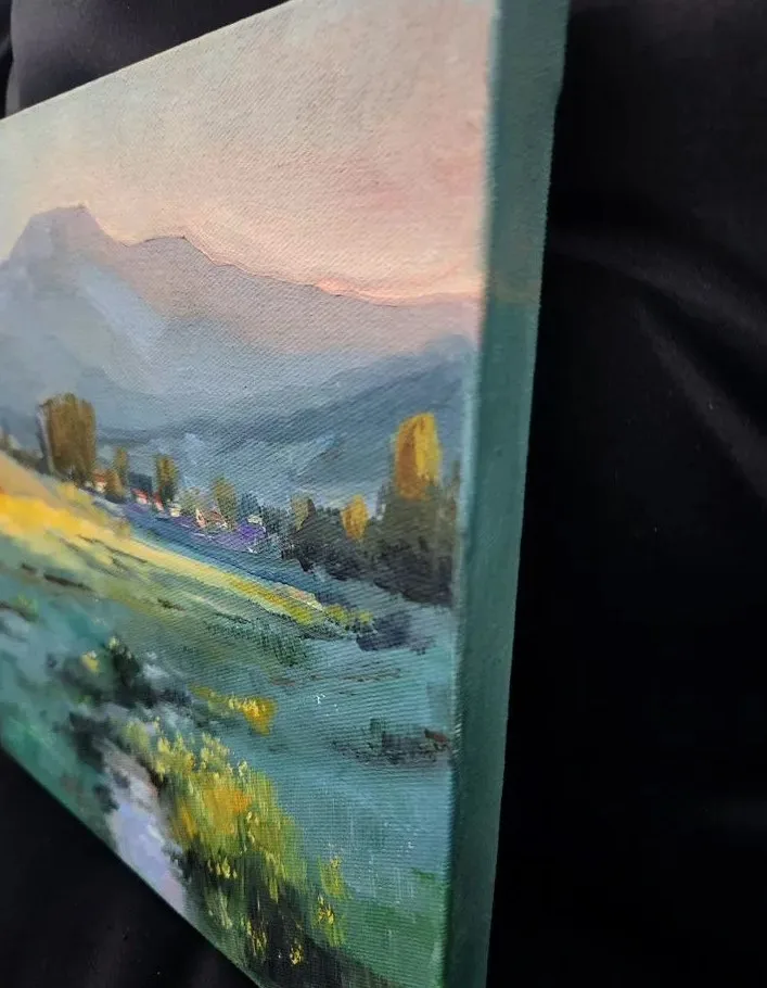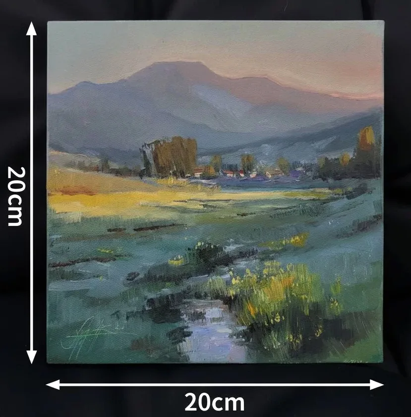 пейзаж о покое и внутреннем равновесии. Мягкие холмы, уходящие вдаль горы и приглушённый свет создают ощущение тишины, в которой можно выдохнуть. Картина передаёт состояние раннего утра или спокойного вечера, когда природа замирает и время будто замедляется.