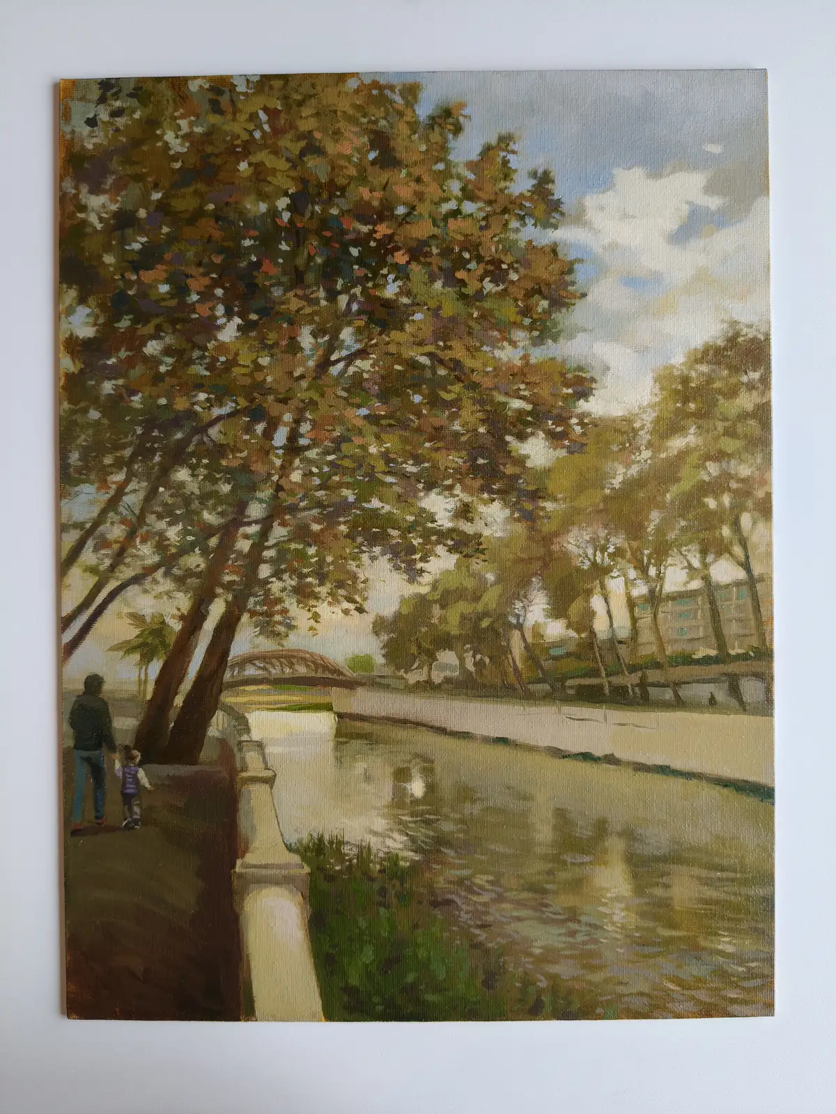 Картина представляет собой прекрасный пример пейзажной живописи, выполненный в технике масляной живописи на холсте. На ней изображен спокойный городской пейзаж с прогуливающейся парой - мужчиной и ребенком, которые любуются природной красотой. В центре композиции находится канал с отражающимися в воде деревьями и небом, что создает ощущение гармонии и умиротворения. Использование теплых оттенков и мягких мазков подчеркивает спокойную атмосферу картины.