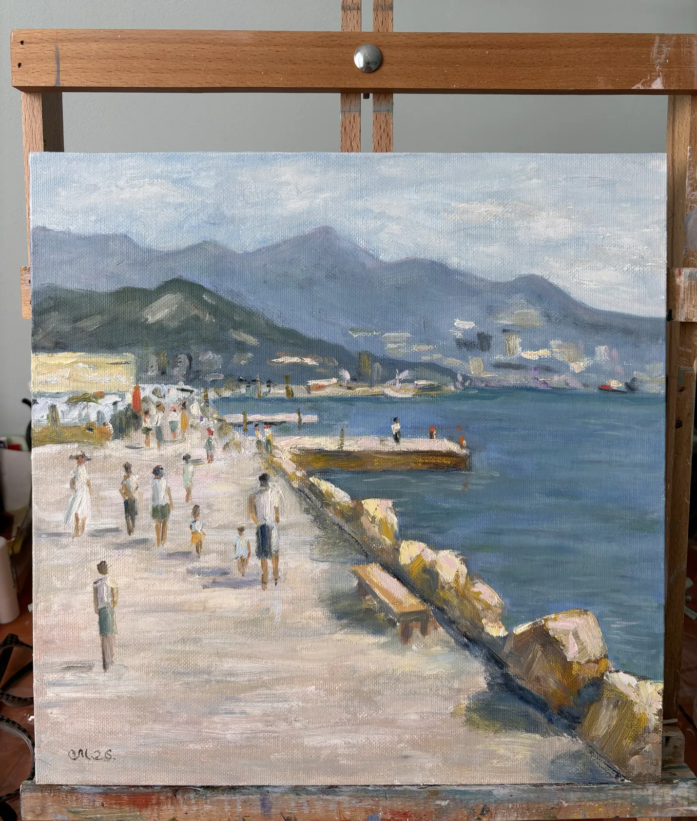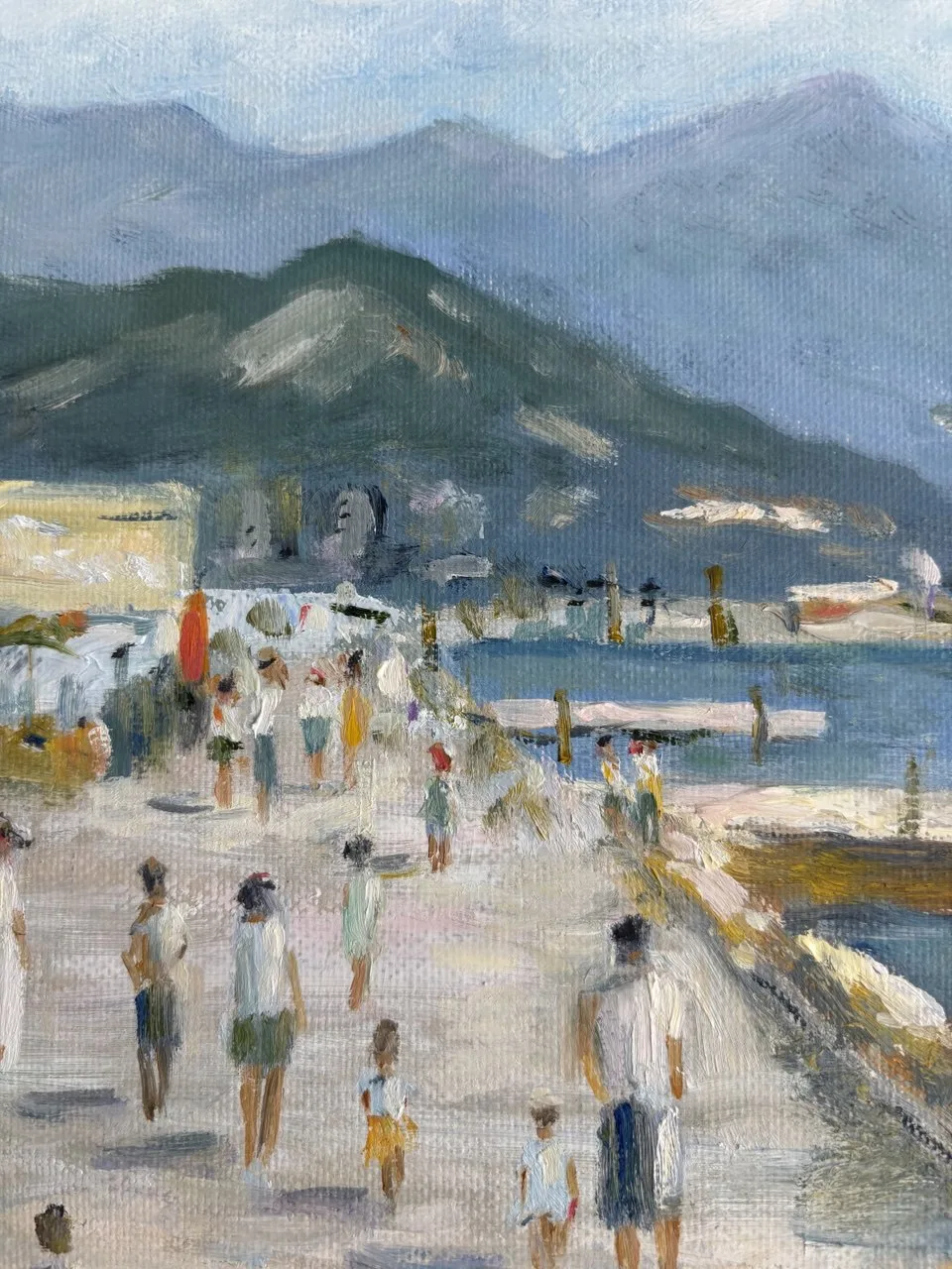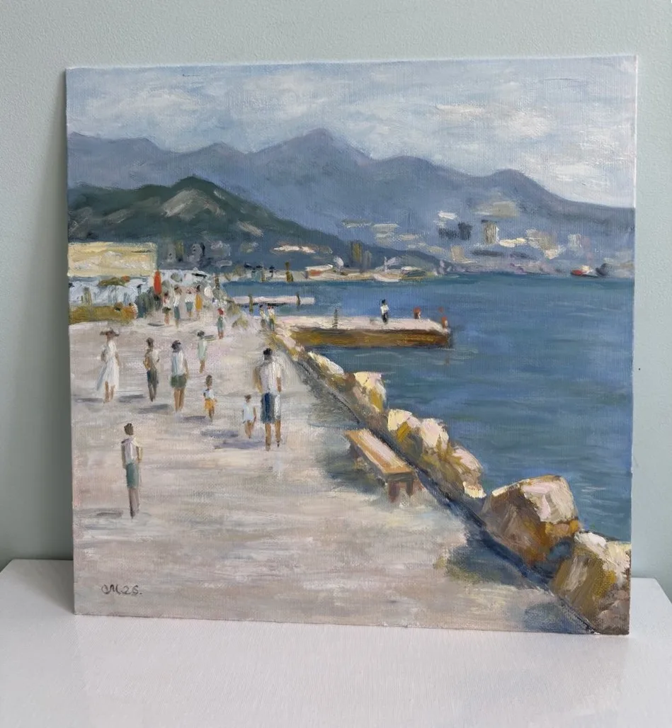 На картине перед нами открывается живописный морской пейзаж, наполненный жизнью и светом. В центре композиции — широкая набережная, по которой гуляют люди, наслаждаясь свежим морским воздухом. Их фигуры, выполненные в мягких, размытых тонах, создают ощущение движения и легкости.