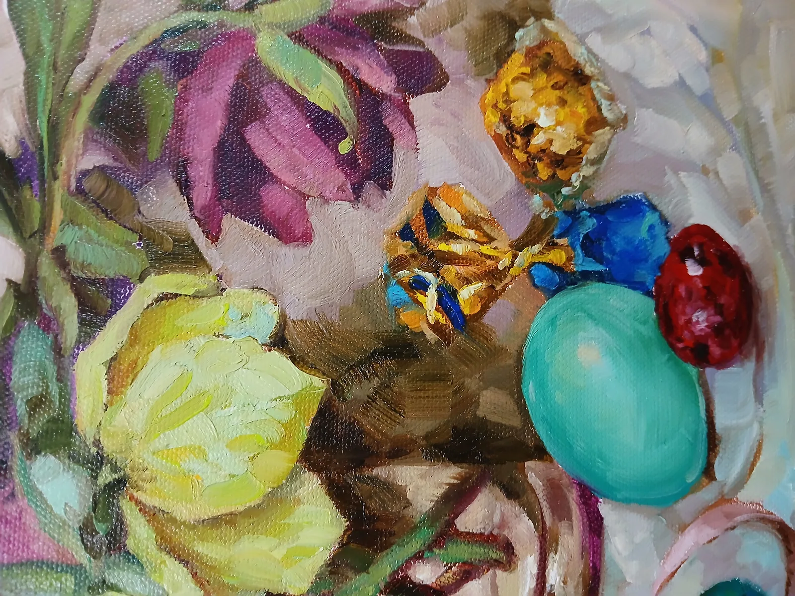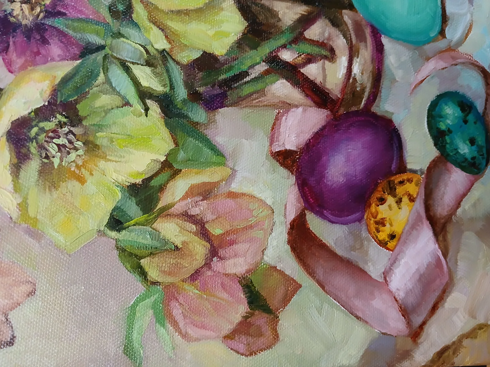 Глядя на эту картину, испытываешь чувство спокойствия и умиротворения. Цветы в вазе и разноцветные яйца на тарелке создают ощущение праздничной атмосферы, будто приближается какой-то радостный день. Хочется рассматривать детали, любоваться игрой света на холсте и теплотой красок. После взгляда на эту работу появляется желание создать что-то подобное своими руками или просто насладиться тихим моментом в окружении близких.