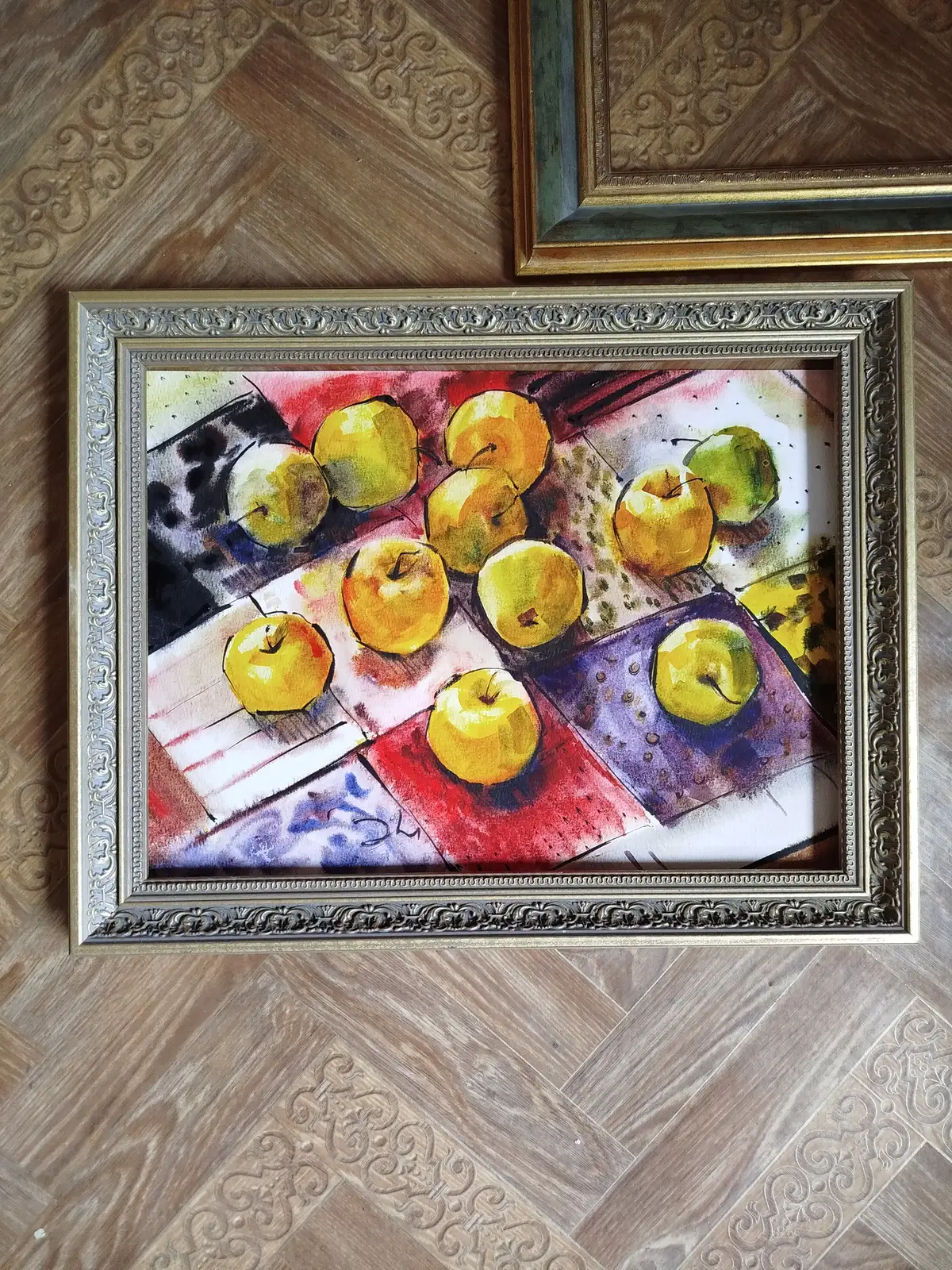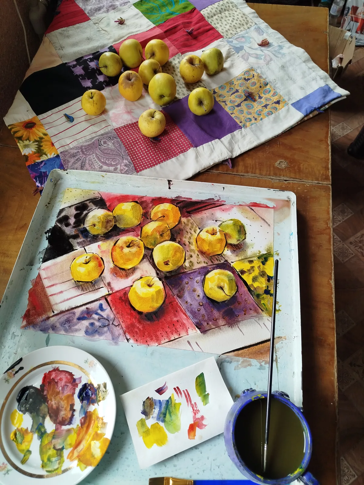 В недолгие два месяца обладания мастерской ,я с упоением экспериментировала )) очень люблю лоскутные одеяла с примитивным рисунком ,когда не пэчворк ,а именно что кусочки ткани ,ну и яблоки люблю во всех проявлениях,есть ,смотреть ,нюхать,рисовать ...