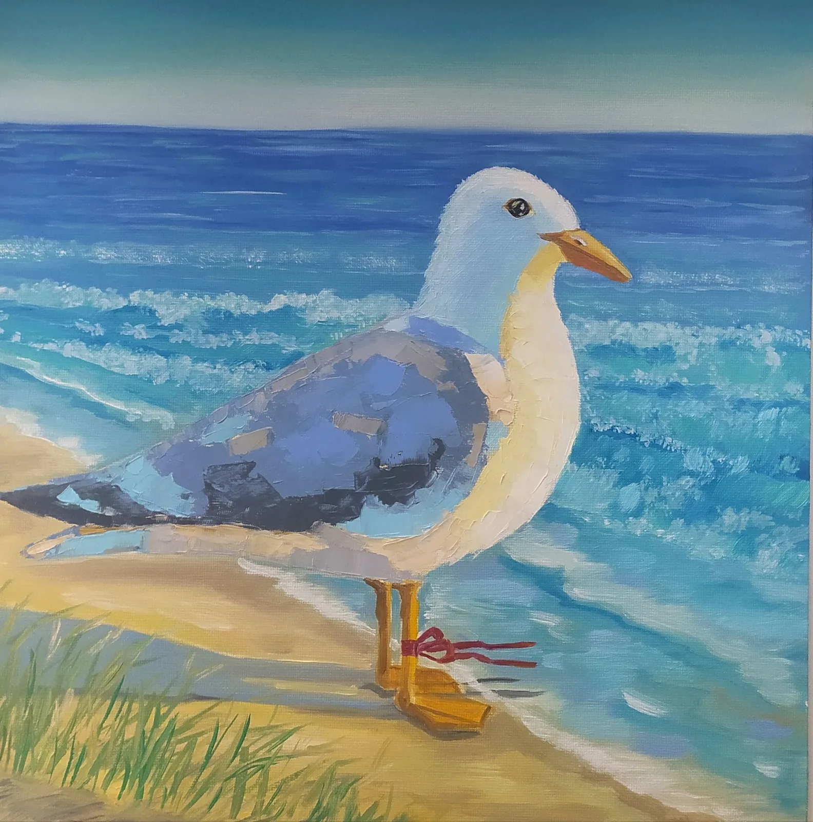 Спокойные голубые тона воды и плавные мазки создают ощущение тепла и комфорта, а контраст между крупной белой уткой и крошечным жёлтым утенком только добавляет очарования.