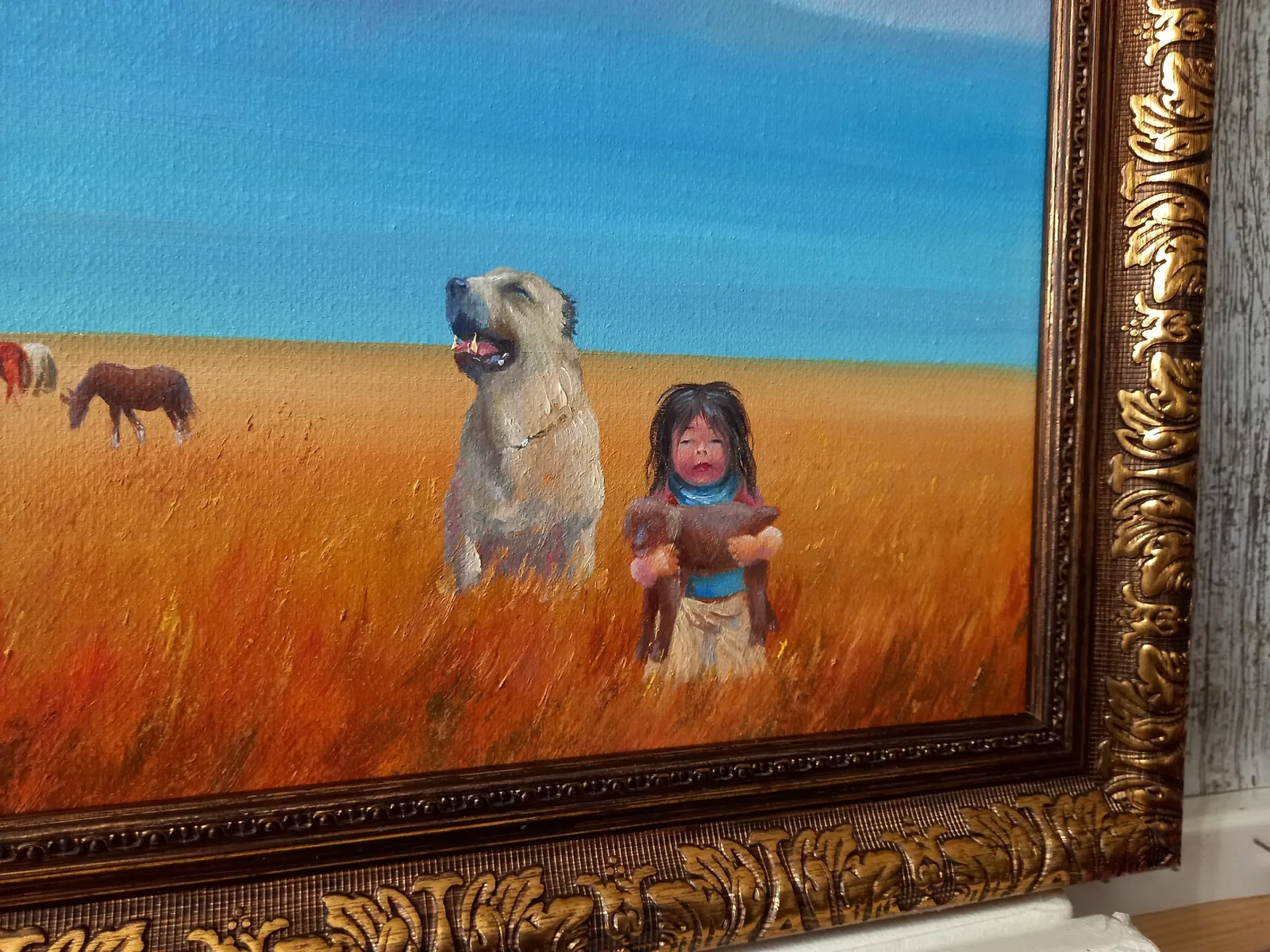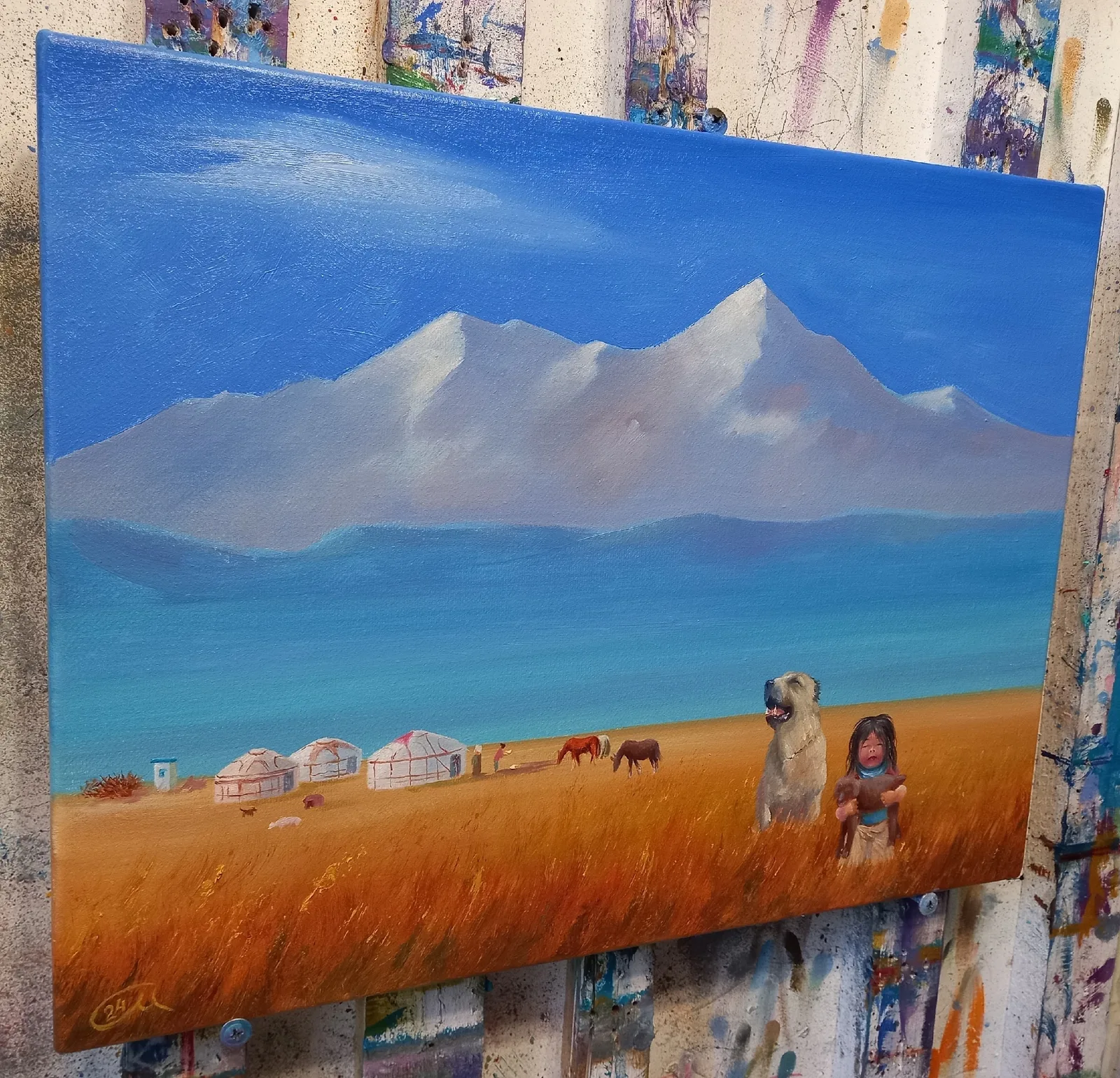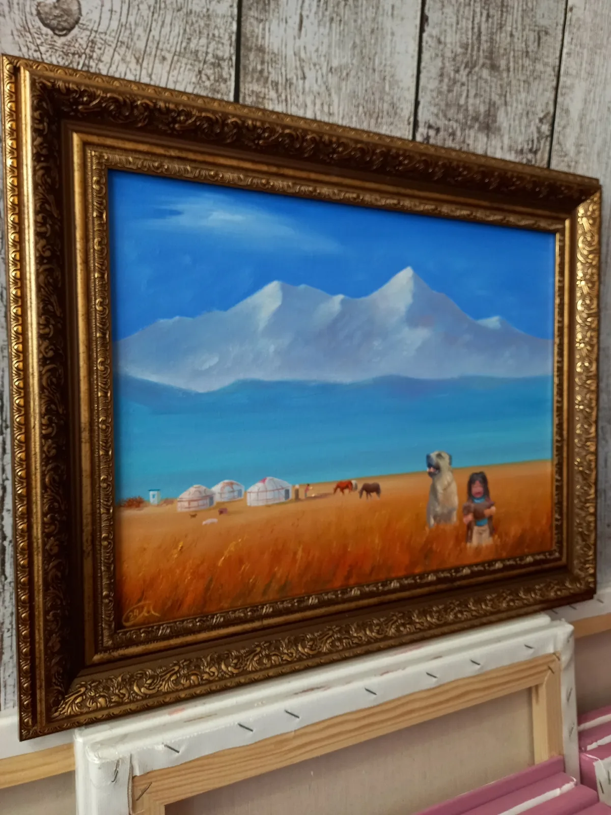 Картина "Дочь степей" Сергея Могилевского сразу привлекает внимание своей простотой и глубиной. На ней изображена степь с юртой вдали и девочкой с собакой на переднем плане. Снежные горы на горизонте добавляют пейзажу величественности. Всё это создаёт чувство спокойствия и связи с природой. Хочется вглядываться в детали, рассматривать лошадей и юрты вдалеке.