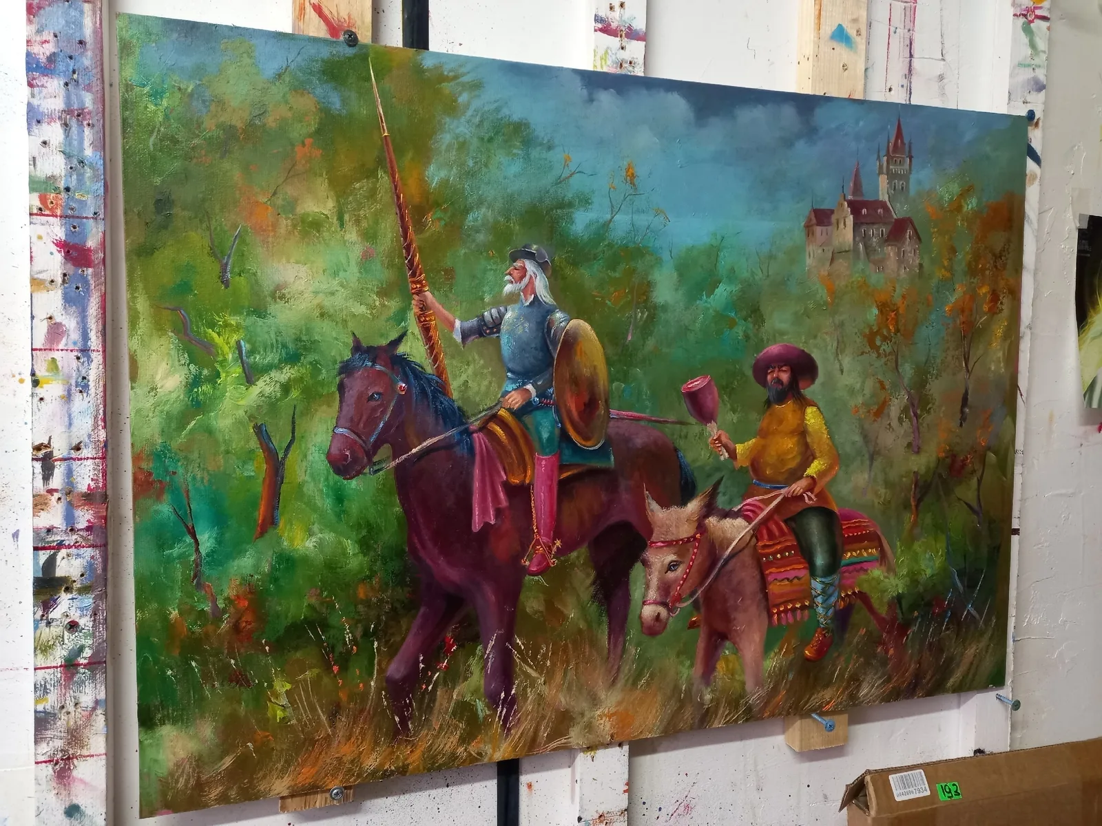 На картине "Посланники Мигеля де Сервантеса" Сергея Могилевского изображены два всадника на фоне зелёного леса и средневекового замка вдалеке. Один из них, старик с длинной белой бородой, сидит на тёмно-коричневом коне и держит в руке длинную палку, а другой, одетый в яркую одежду, едет на ослике и держит кубок. Композиция создаёт ощущение спокойствия и размеренности. Хочется вглядываться в детали и представлять историю, которую художник хотел рассказать. В целом, картина создаёт тёплое и уютное настроение.