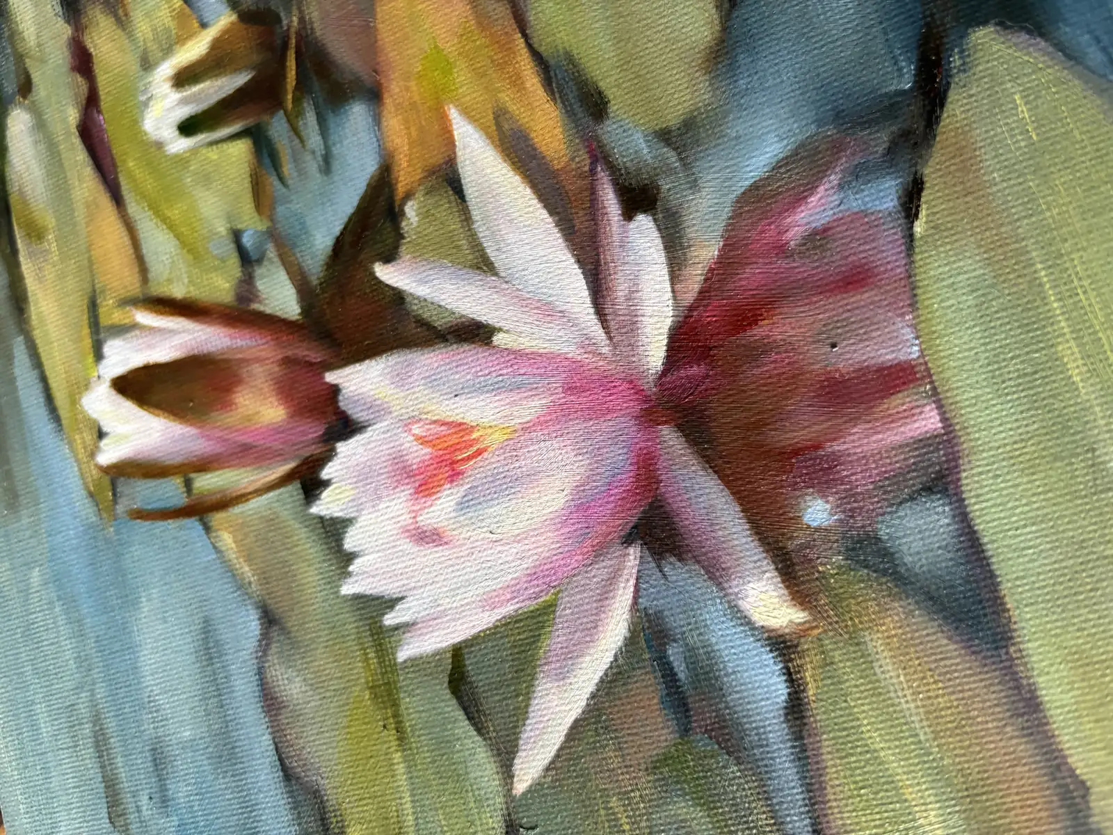 «Нимфея. Голубая вода» — так назвала эту картину, написанную маслом на холсте, натянутом на оргалит. Размер небольшой — всего 20х20, но сколько в ней жизни! Работала над ней с удовольствием, и вдохновила меня на создание этого пейзажа красота природы. Спокойная гладь воды с плавающими на поверхности листьями и нежными цветами — все это создает атмосферу умиротворения.