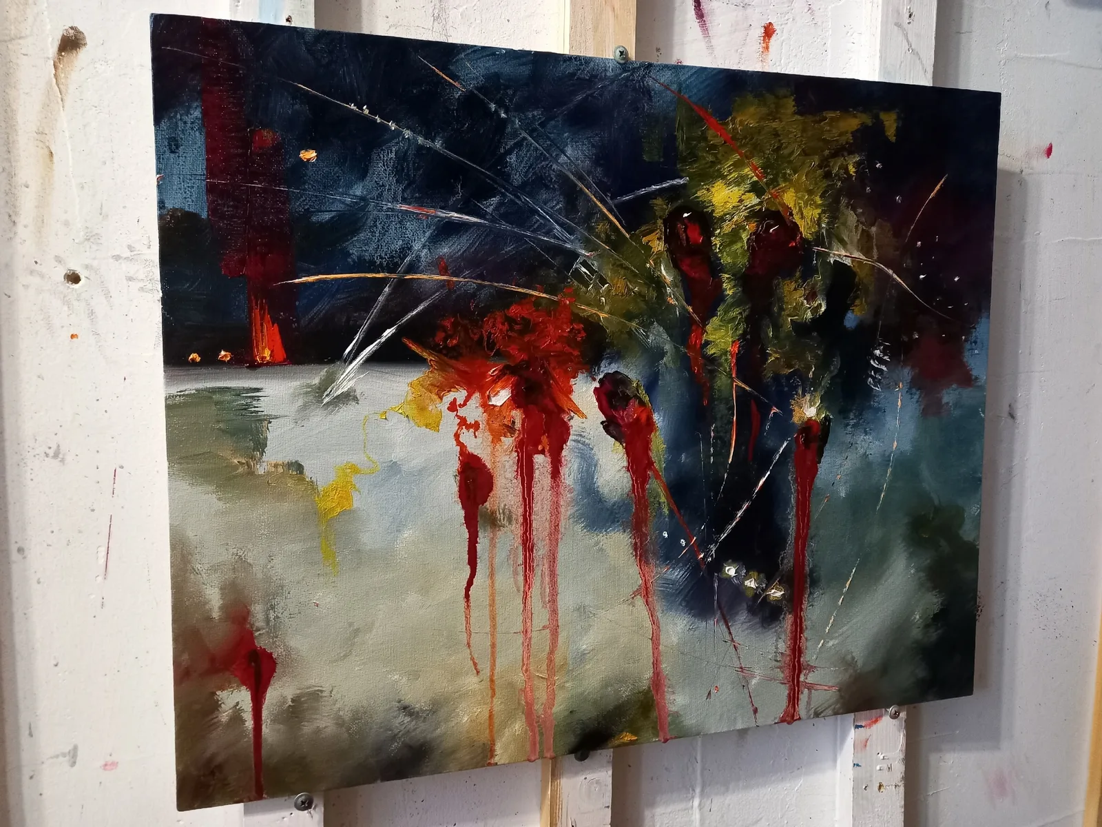Картина Сергея Могилевского "Систематизатор теней, запутавшийся в картотеке собственных сновидений" - это взрыв эмоций на холсте, где темно-синие и зеленоватые тона создают мрачноватый фон, а яркие мазки красного и желтого притягивают взгляд. Композиция кажется хаотичной, но в этом хаосе есть своя логика и красота. Масляные разводы и потеки добавляют работе объем и динамику, делая её живой. В общем, картина цепляет, и хочется разглядывать детали, теряясь в игре цвета и форм.